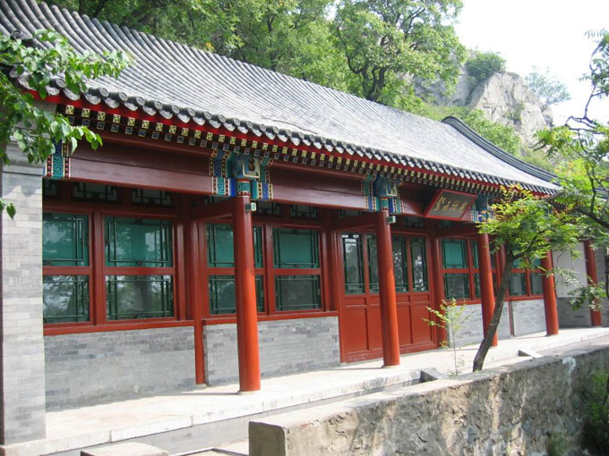 今天的“鹫峰山庄”山门是根据史料记载依原貌重新修建的,此外,还依史料在原址重新修建了“听松待宾”,“餐云饮燕”。